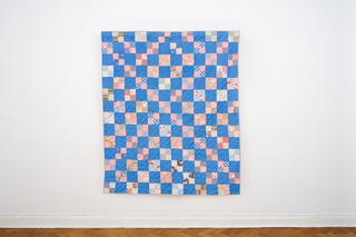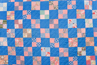 165 x 200 cmpatchwork ca 1920-1950hand stitched cotton four patchbrown, white striped linen/cotton backing hand quilted