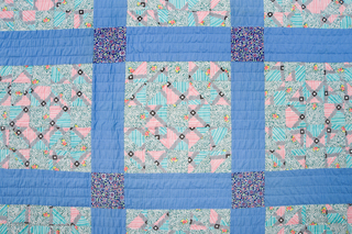 180 x 205 cmpatchwork ca 1920-1960hand and machine stitched cottongrey and white striped cotton backinghand quilted